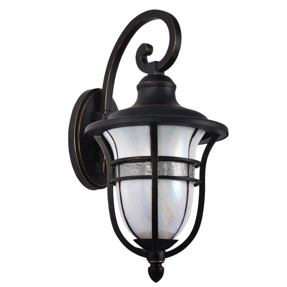 Our lovely Kenya Outdoor Wall Sconce will add charm and appeal to any outdoor area in your home. The inverted bell shade is crafted of light amber glass that will cast a warm glow when the sconce is lit. The shade is encased in an open metal frame that is finished in deep Golden Black. Kenya hangs beautifully from a round metal backing plate and gracefully scrolled wall arm, both finished to match in Golden Black. Ideal for external doorways, our Kenya Outdoor wall sconce is as durable as it is beautiful and is guaranteed to keep your home’s exterior beautifully and safely illuminated for many years to come.