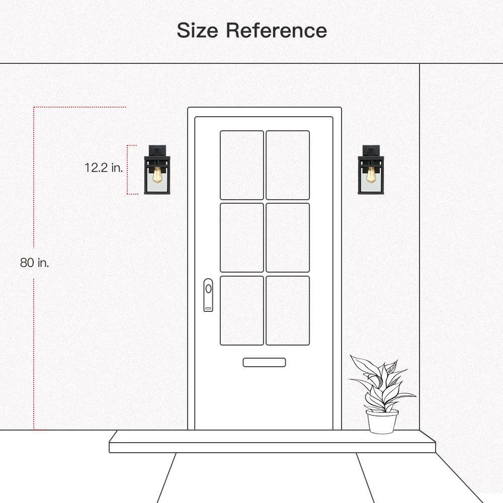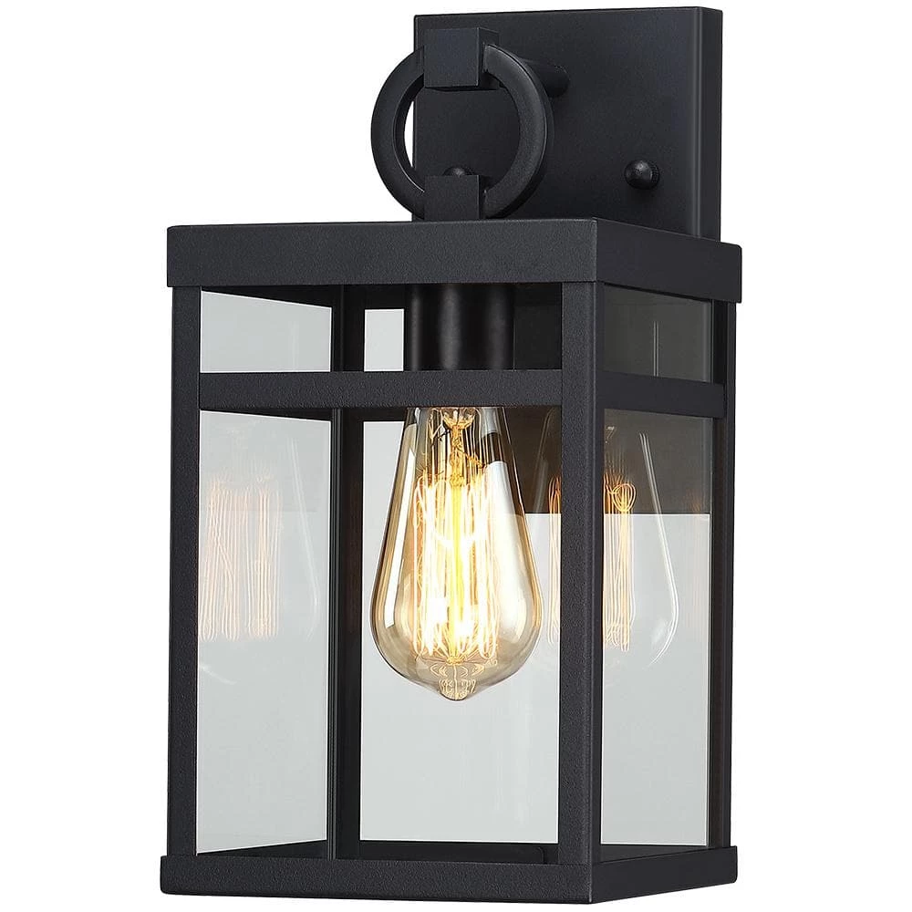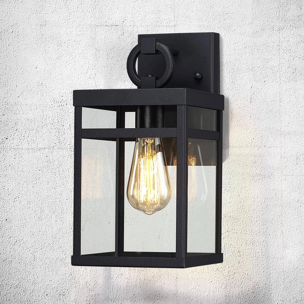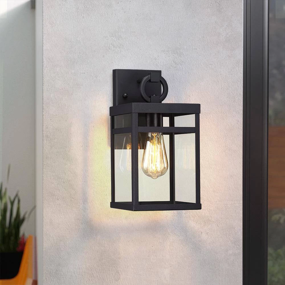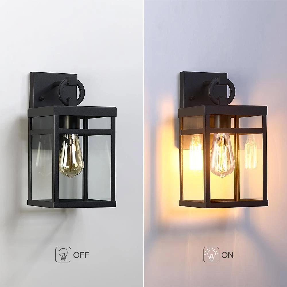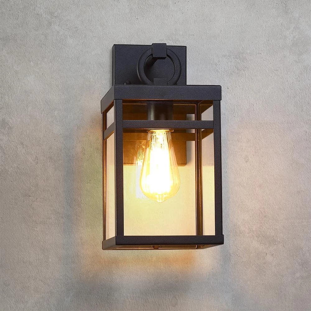 This modern Exterior lantern lighting fixture features a sturdy powder coated black metal frame body and clear glass panels, square backplate and a statement of bold loop suspension. Pairing the transitional outdoor wall sconce with a vintage bulb(not included) is recommended to fully illuminate the glass and complement the overall aesthetic. Ideal for Front Porch, Patio, Garage, Deck, Balcony etc.
