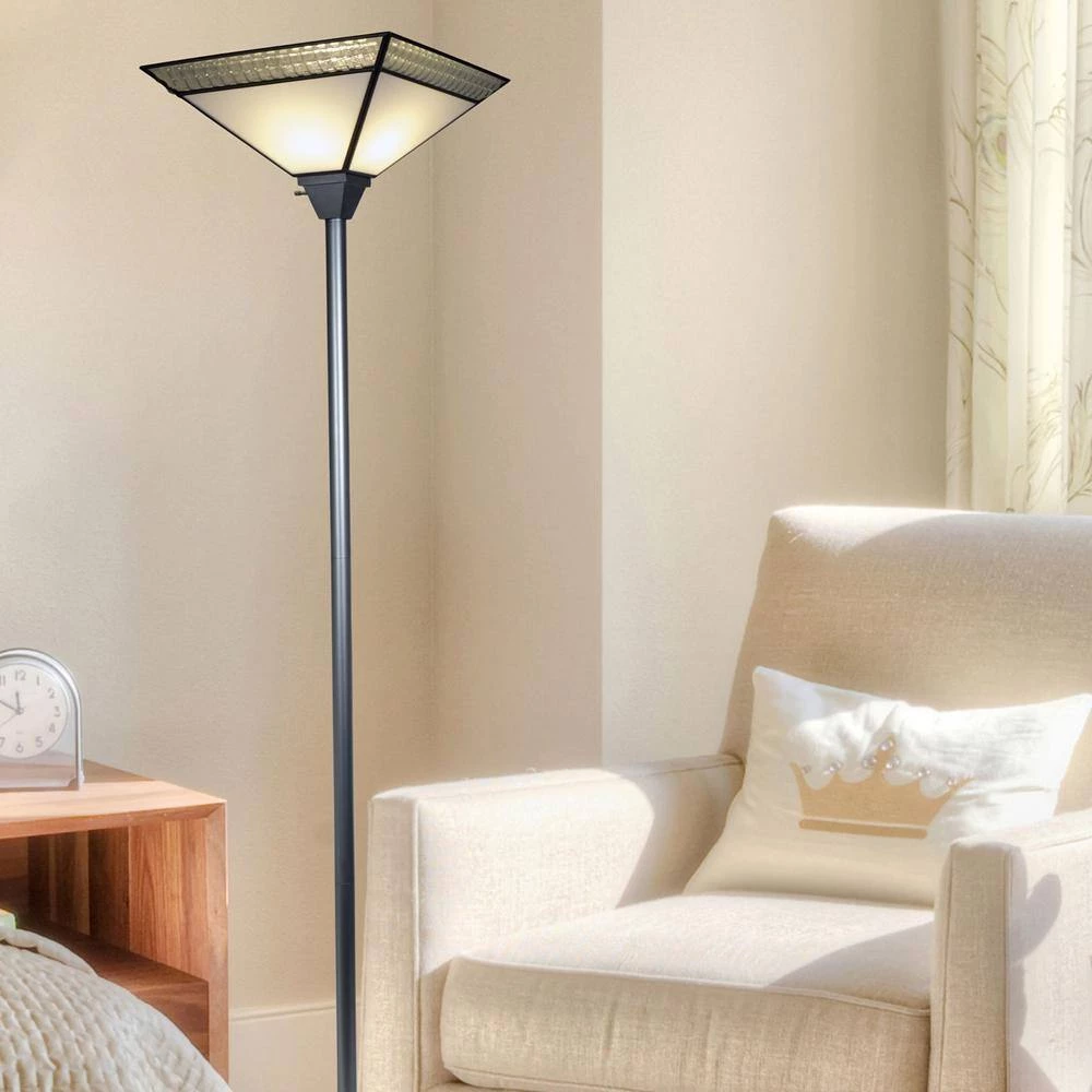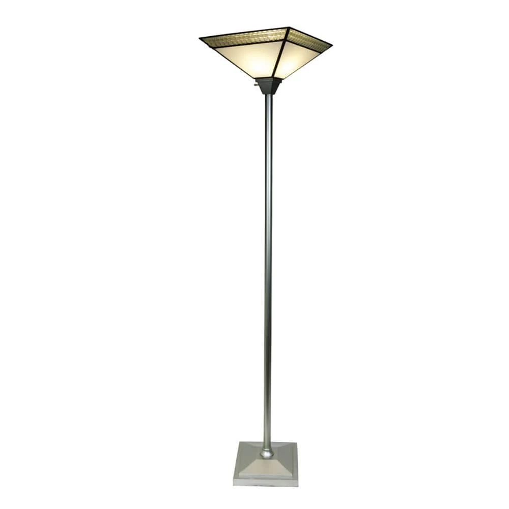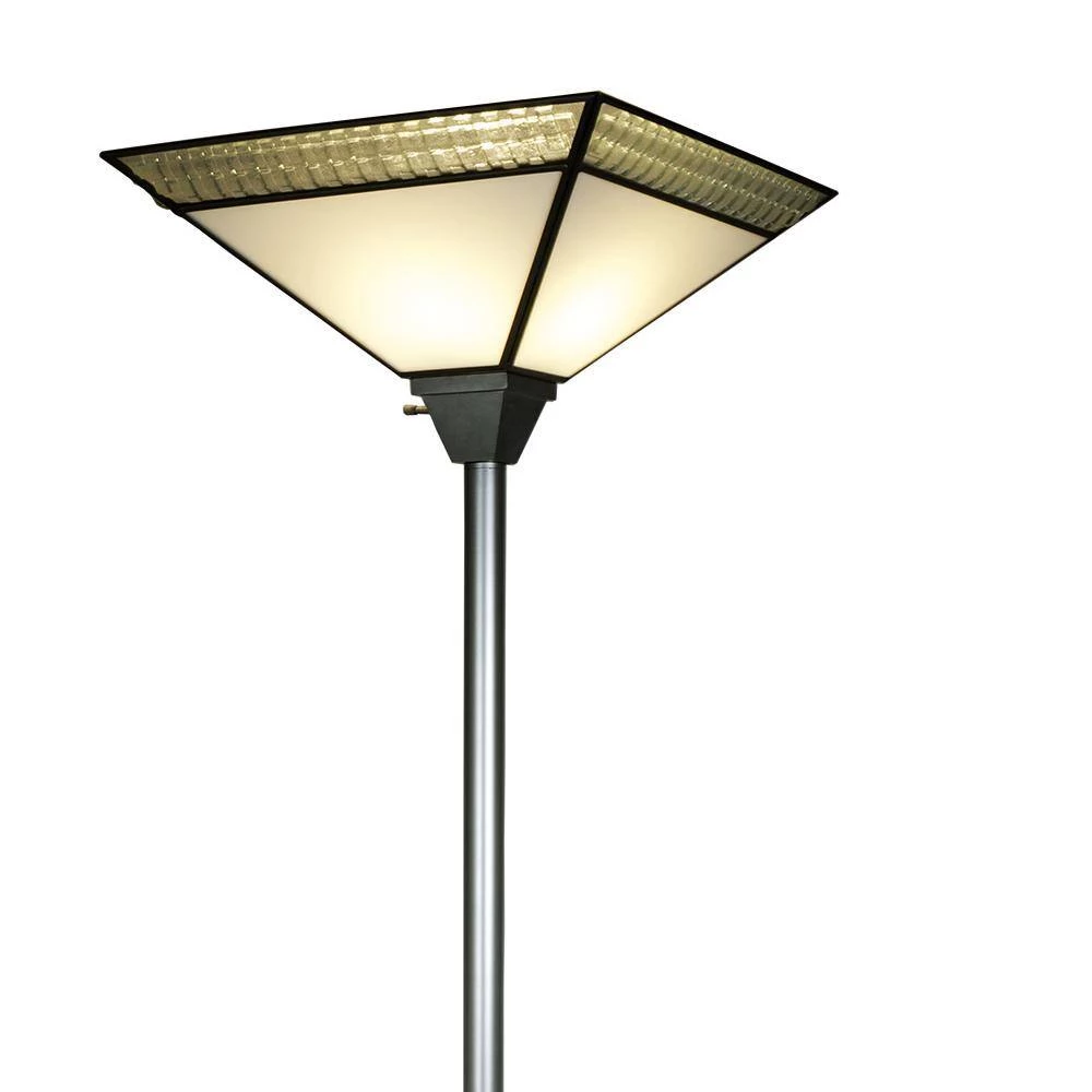 Our Leonetto Fused Glass Torchiere Floor Lamp features an Arts and Crafts era look with contemporary elements that make it the ideal lighting solution for any lighting need. The stately fixture features an inverted square shade crafted of large triangles of light amber. A wide band of dark amber fused glass provides contrast and a pop of sparkly color when the lamp is lit. The shade sits atop a sleek metal base that is finished I shimmery silver that includes a center column and raised triangular pedestal. An ideal choice next to a favorite reading chair or comfy sofa, our Leonetto Fused Glass Torchiere Floor Lamp is powerful enough to provide whole room lighting your family will enjoy for years to come.