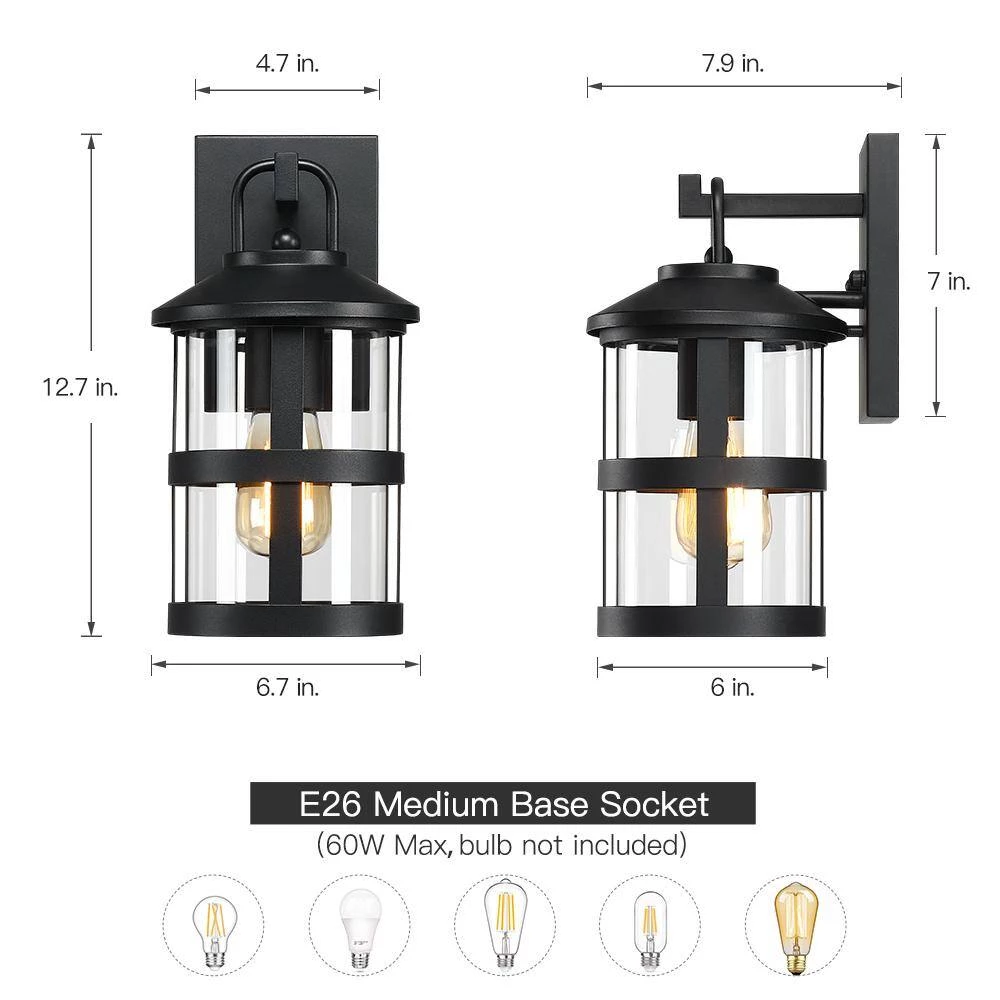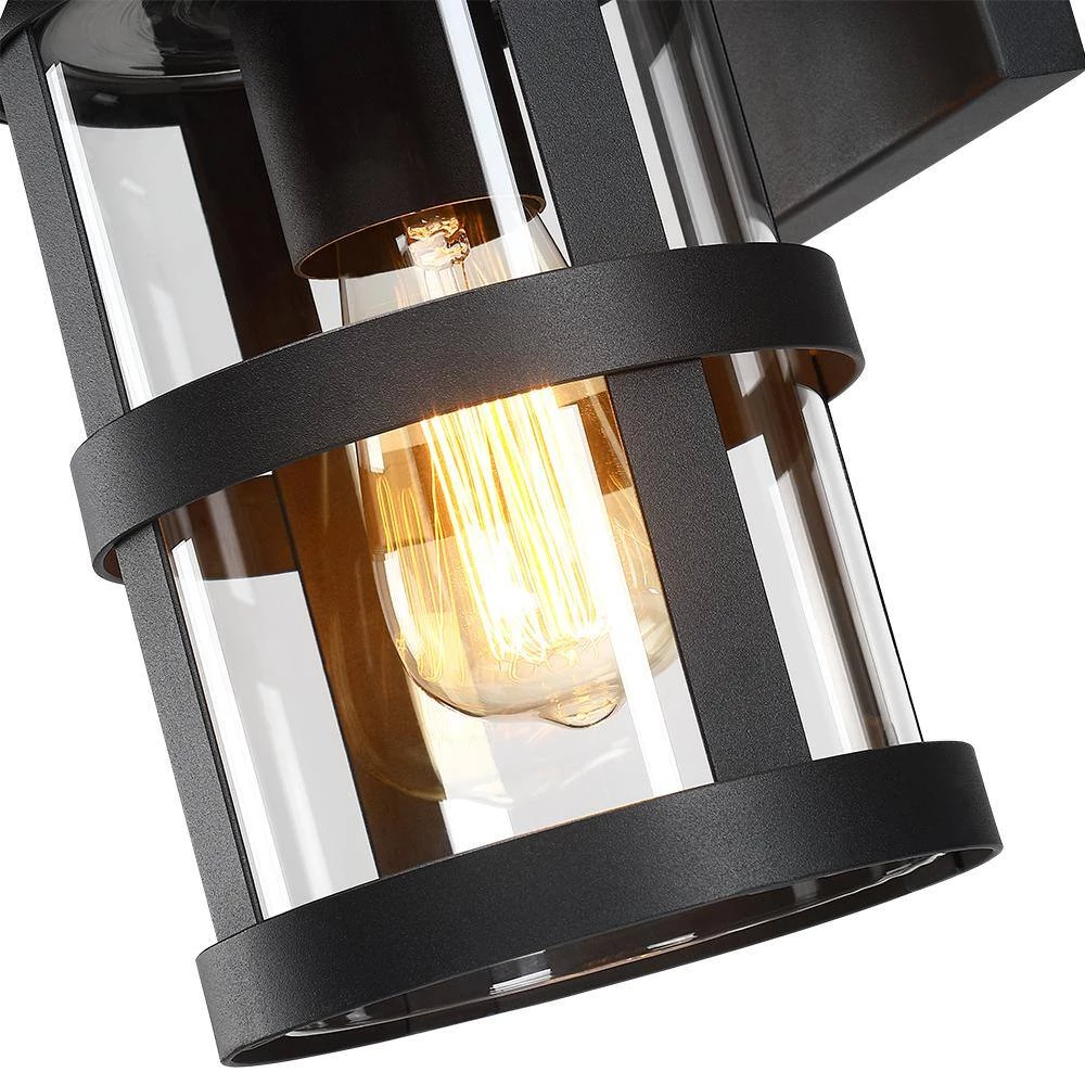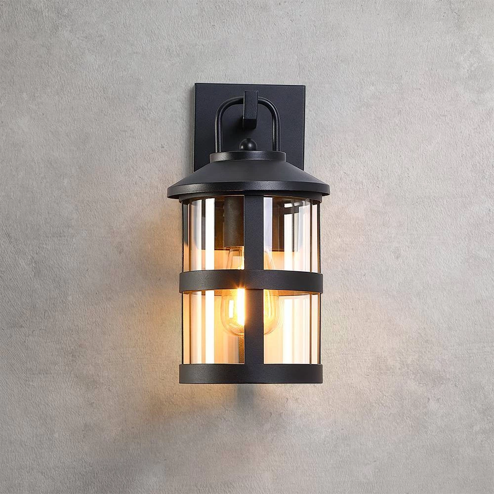 This modern exterior lantern lighting fixture features a stunning clear glass cylinder and a lantern style powder-coated black body as it rests upon a strong arm connected to a rectangular backplate. Pairing the traditional outdoor wall light with a vintage bulb(not included) is recommended to fully illuminate the glass which spreads a warm and inviting glow. Ideal for Front Porch, Patio, Garage, Deck, Balcony etc.