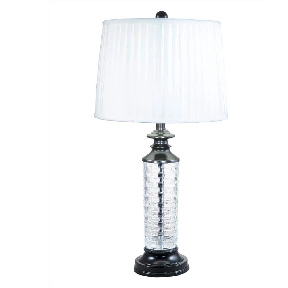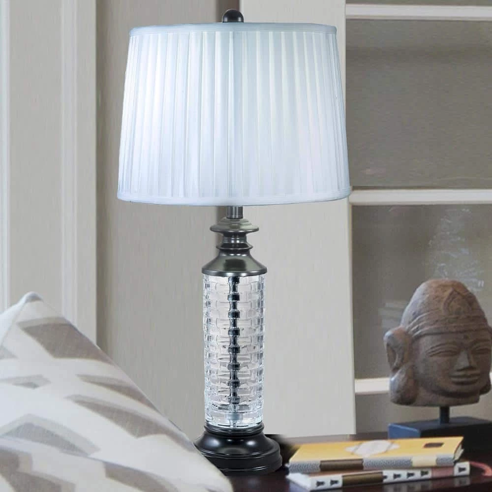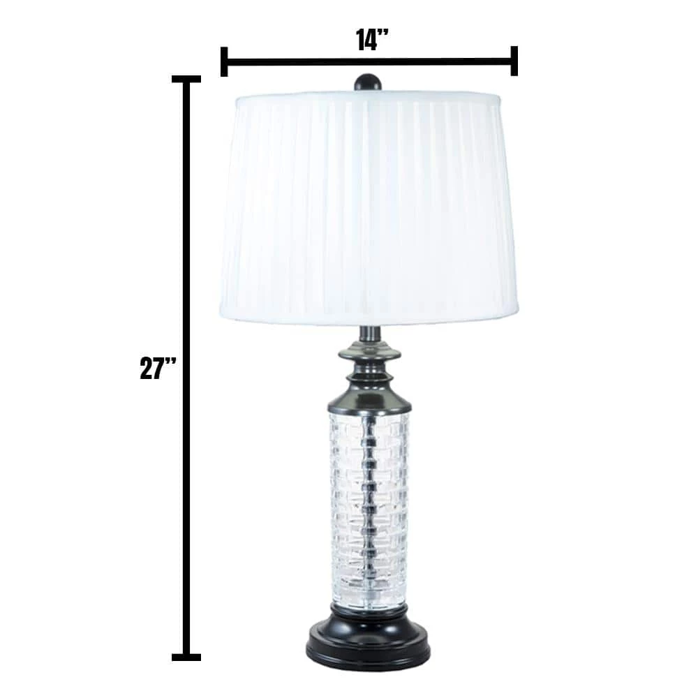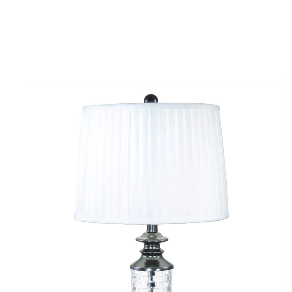 The casual elegance of our Overland 24% Lead Crystal Table Lamp easily assimilates into any decor style. The tall fixture features metal center column that is surrounded by a 24% lead crystal cylinder. The cylinder is delicately faceted in an allover basket weave pattern which is designed gently refract the lamplight outward into the room. We topped Overland with a pleated drum shade in crisp white softback fabric and complementary finial. The metal base is finished in deep Ebony Black, which provides an excellent contrast and adds to the contemporary feel. A perfect choice in living rooms or bedrooms, our Overland 24% Lead Crystal Table Lamp is crafted to last to provide you with many years of stylish and reliable lighting.