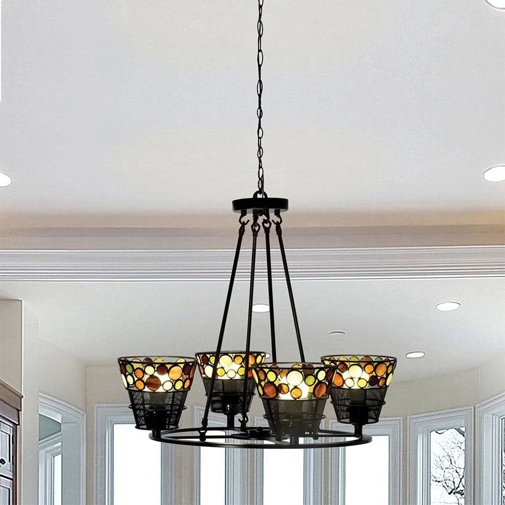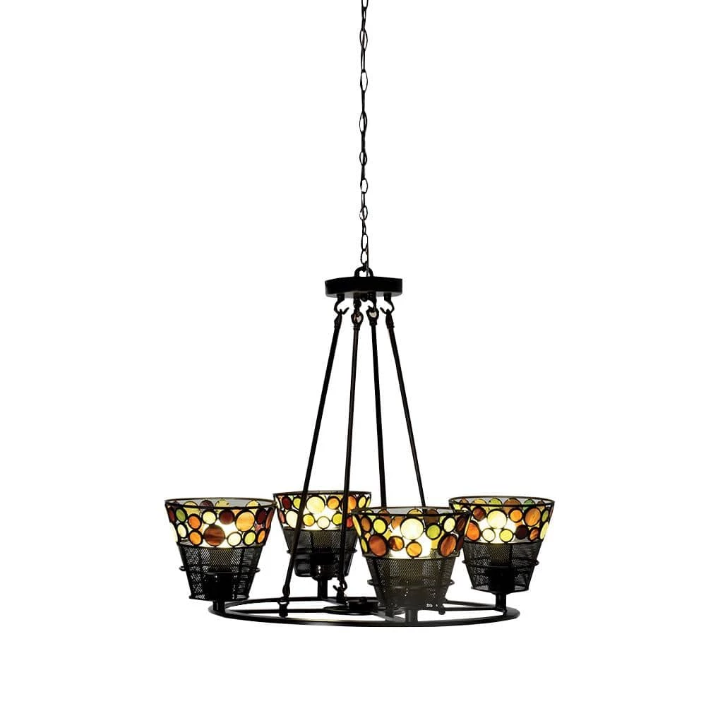 Our Pasqual 4-light Mesh Tiffany Hanging Fixture features a contemporary style that will adapt to your home’s evolving decor. The large fixture features a metal base that is finished in Antique Bronze. Hung from a metal ceiling canopy and wire chain, 4 support tubes hold a large circular base. 4 metal mesh candle cups hold matching art glass shades that are crafted of round glass-pieces in amber, yellow and white. Each-piece is wrapped in matching filigree that allows extra-light to shine through. A fantastic way to illuminate a larger contemporary dining area, our Pasqual 4-light Mesh Tiffany Hanging Fixture also makes a grand way to greet guests in foyers and entryways with higher ceilings.