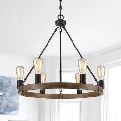 Hector 6-Light Black Wagon Wheel Farmhouse Chandelier with Wood Accents by TRUE FINE