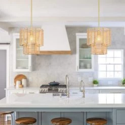 Dayereh 12 in. 1-Light Coastal Tiered Rattan Drum Pendant Light with Brass Canopy by TRUE FINE