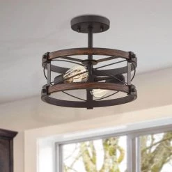 Richwood 12 in. 2-Light Distressed Black/Wood Tone Rustic Semi-Flush Mount by TRUE FINE
