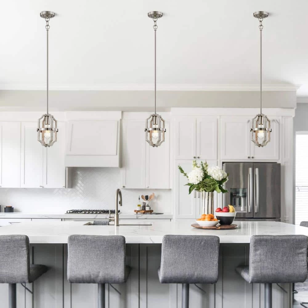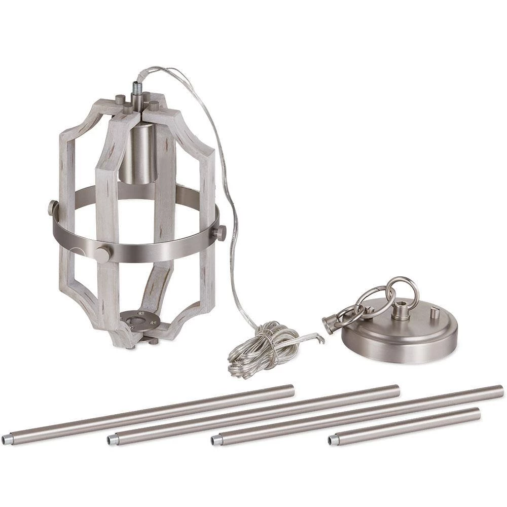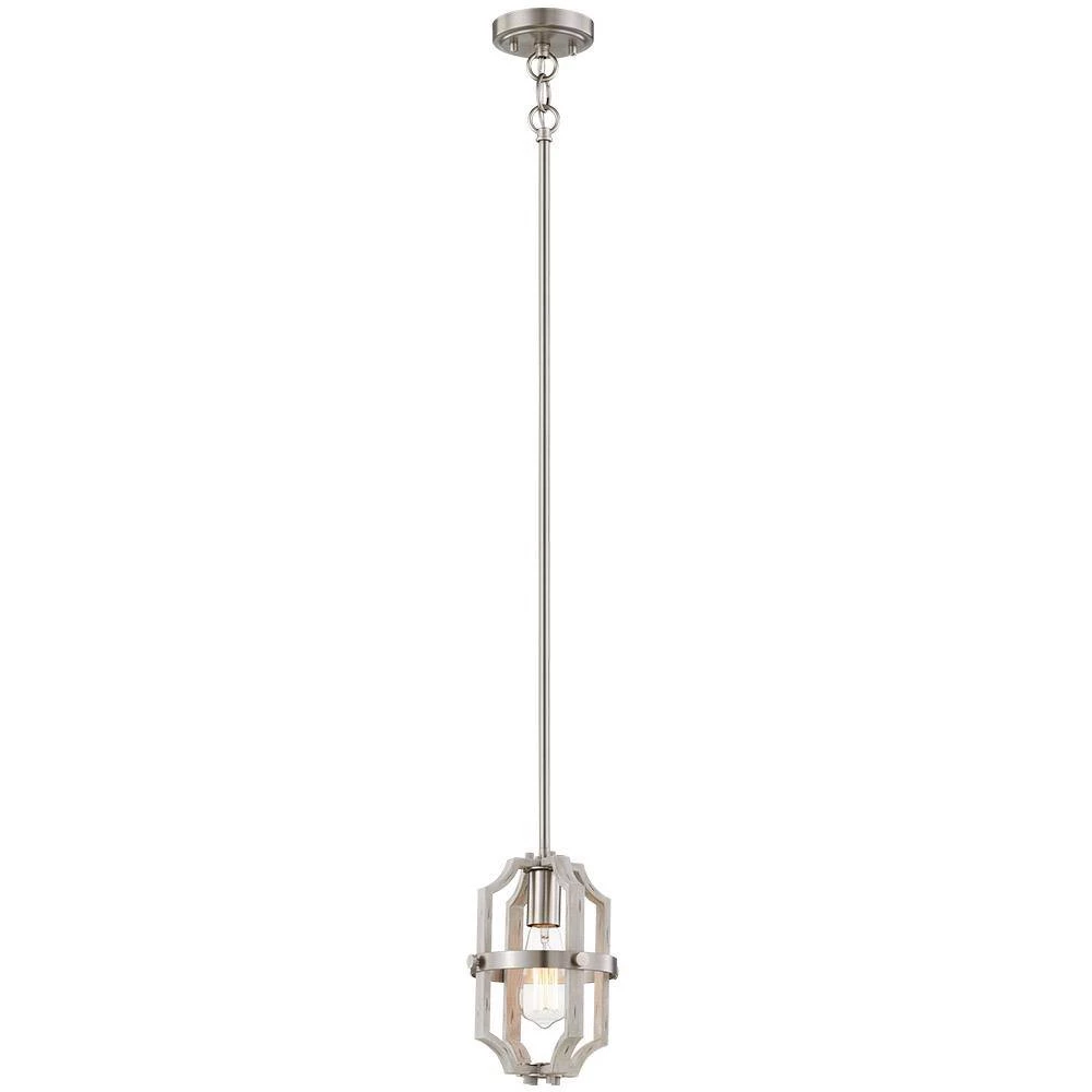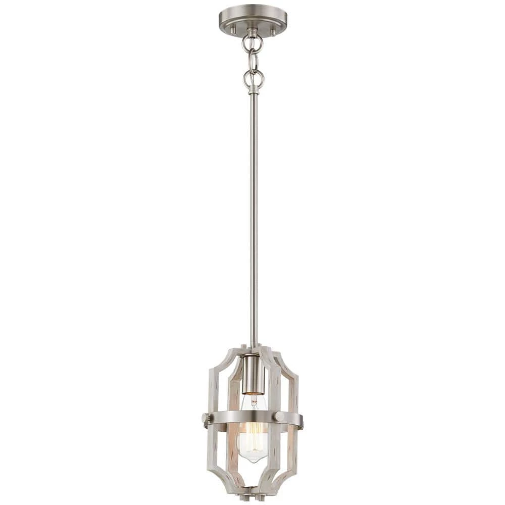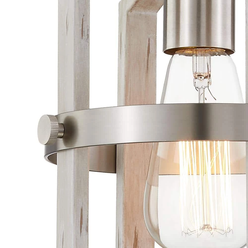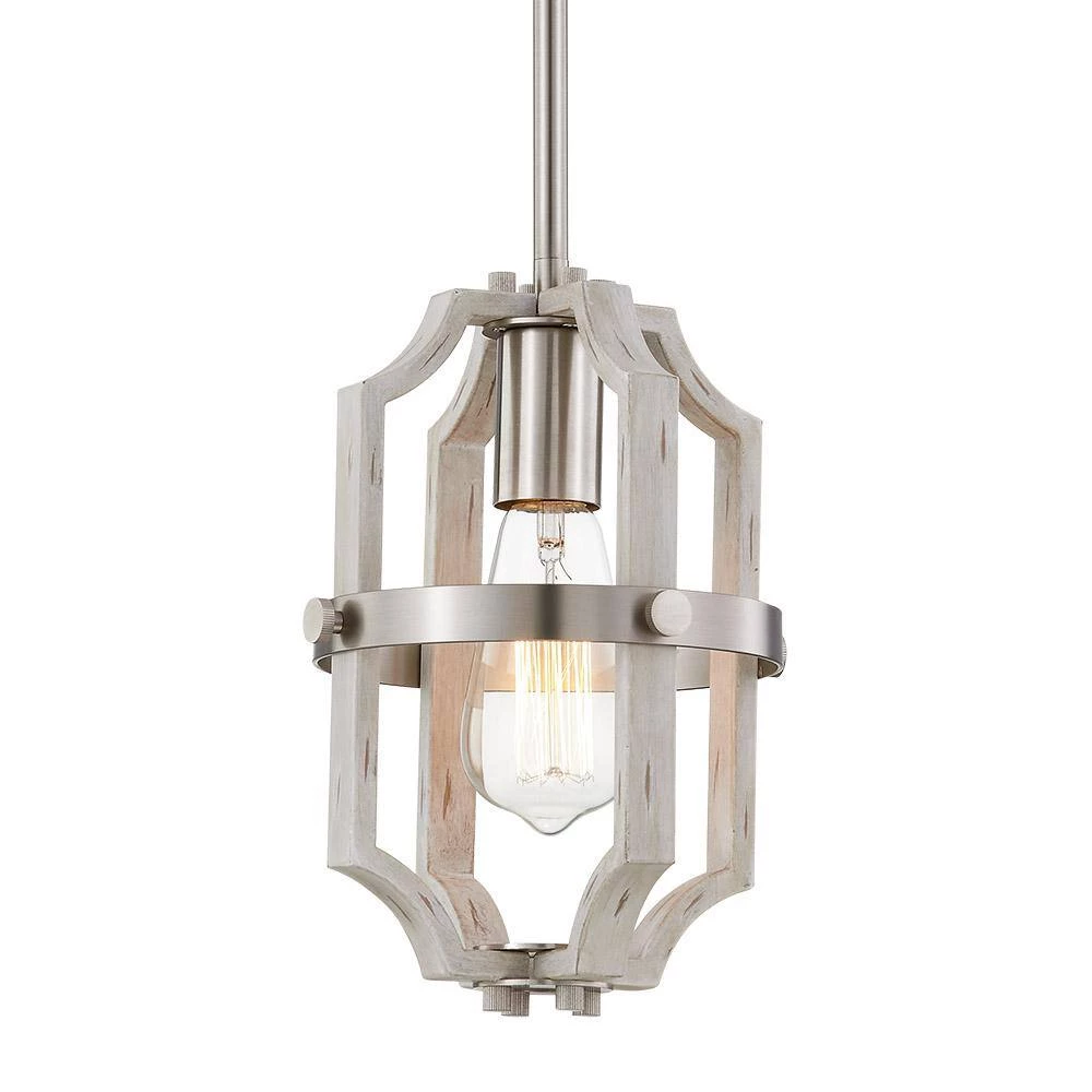 The Richwood 7.5 in. Mini pendant features a rustic modern look with its white washed wood finish. The corner-curved open cage structure, and the blend of white washed wood tones as well as brushed nickel metal details, create a style that is perfect with rustic and modern decor, ideal for illuminating coastal, farmhouse, traditional, transitional, modern, craftsman, and bohemian interiors. A remarkable addition to your hall way or foyer, or suspended above your kitchen island, breakfast bar, or table of any kind.