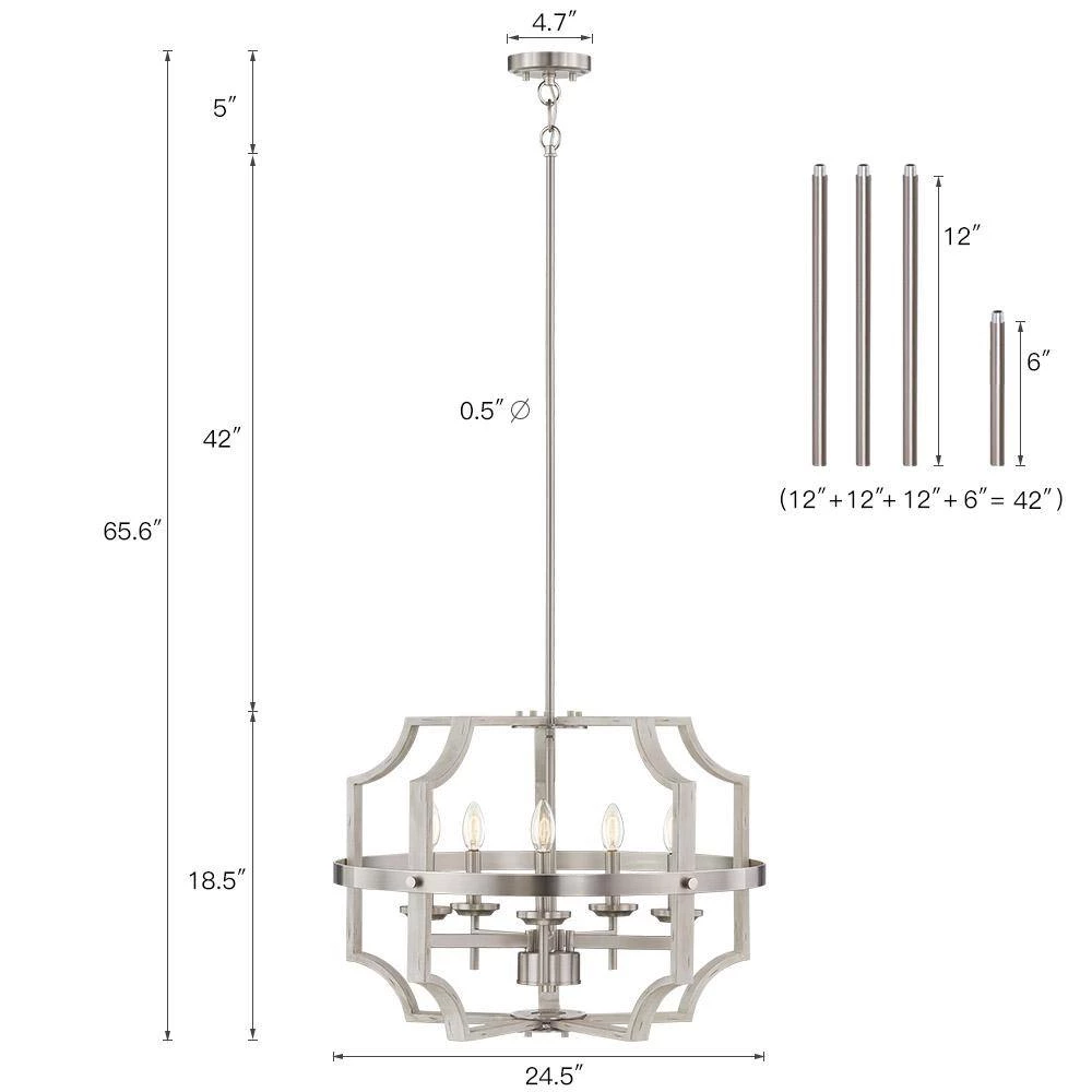 - Fixture dimensions: 24.5 in. W x 24.5 in. D x 65.5 in. H (maximum hanging length)
