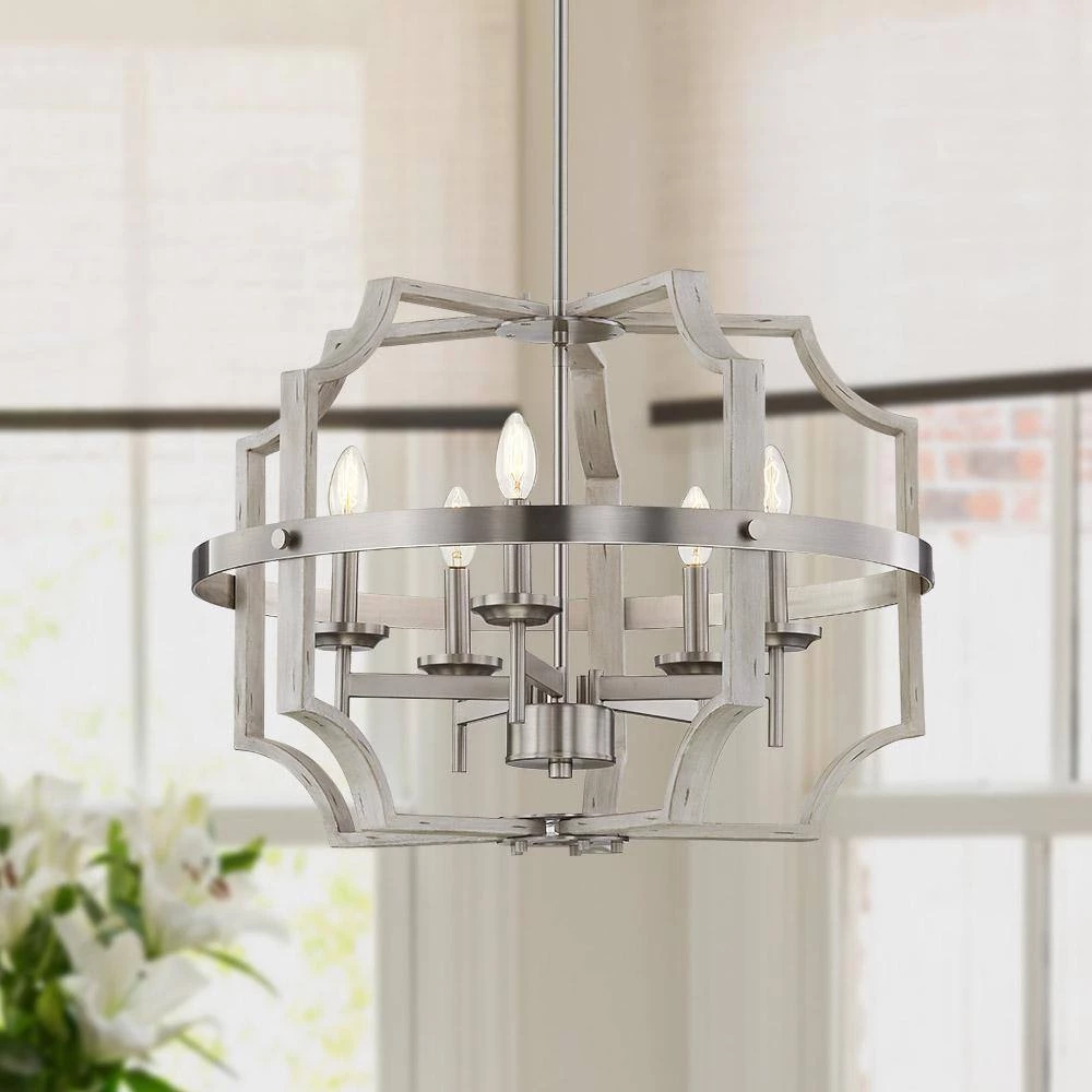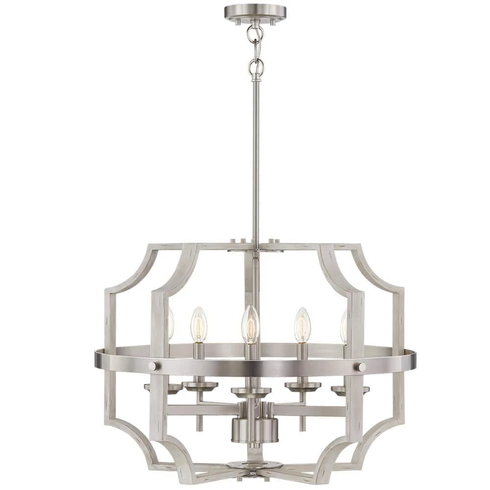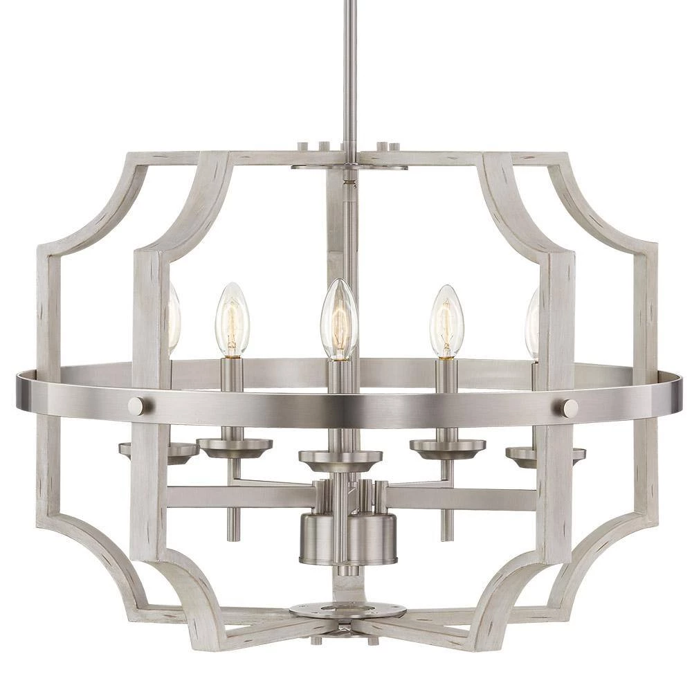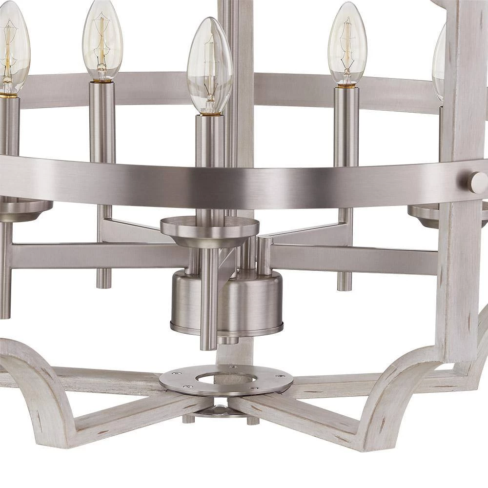The True Fine Richwood chandelier’s two-tone design brings texture and style to any space. Finished in brushed nickel with wood tone metal combination, this chandelier complements modern and farmhouse interior decor with its rustic charm, ideal for illuminating coastal, farmhouse, traditional, transitional, modern, craftsman, and bohemian interiors. A remarkable addition to your living room, kitchen dining room, or den area.
