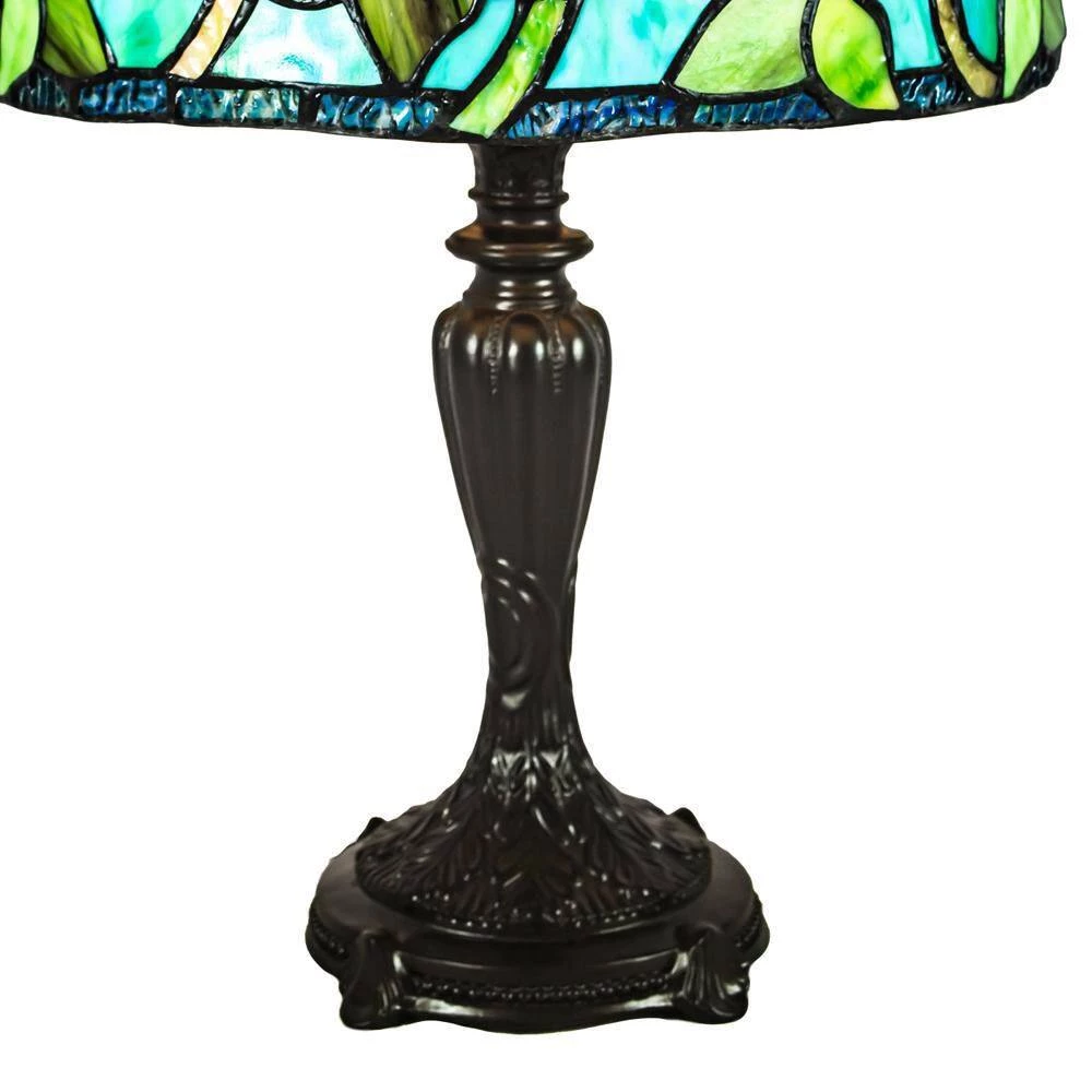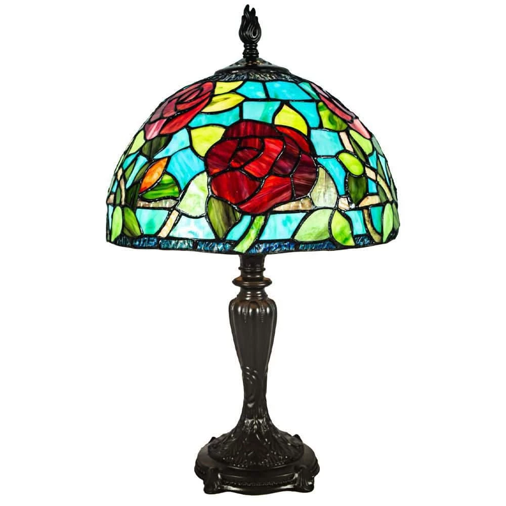 The commanding presence and soothing colors of our Saros Rose Tiffany Table Lamp will be the centerpiece of any room in which it is displayed. The shade with its teal and red rose design with blue irridescent art glass band around the bottom of the shade will cast a colorful glow about the room when the lamp is illuminated. The shade sits atop a sleek bronze base that is finished in antique dark coffee. A perfect whole room light, our Saros Rose Tiffany Table Lamp is also great bedside or next to a favorite reading area.