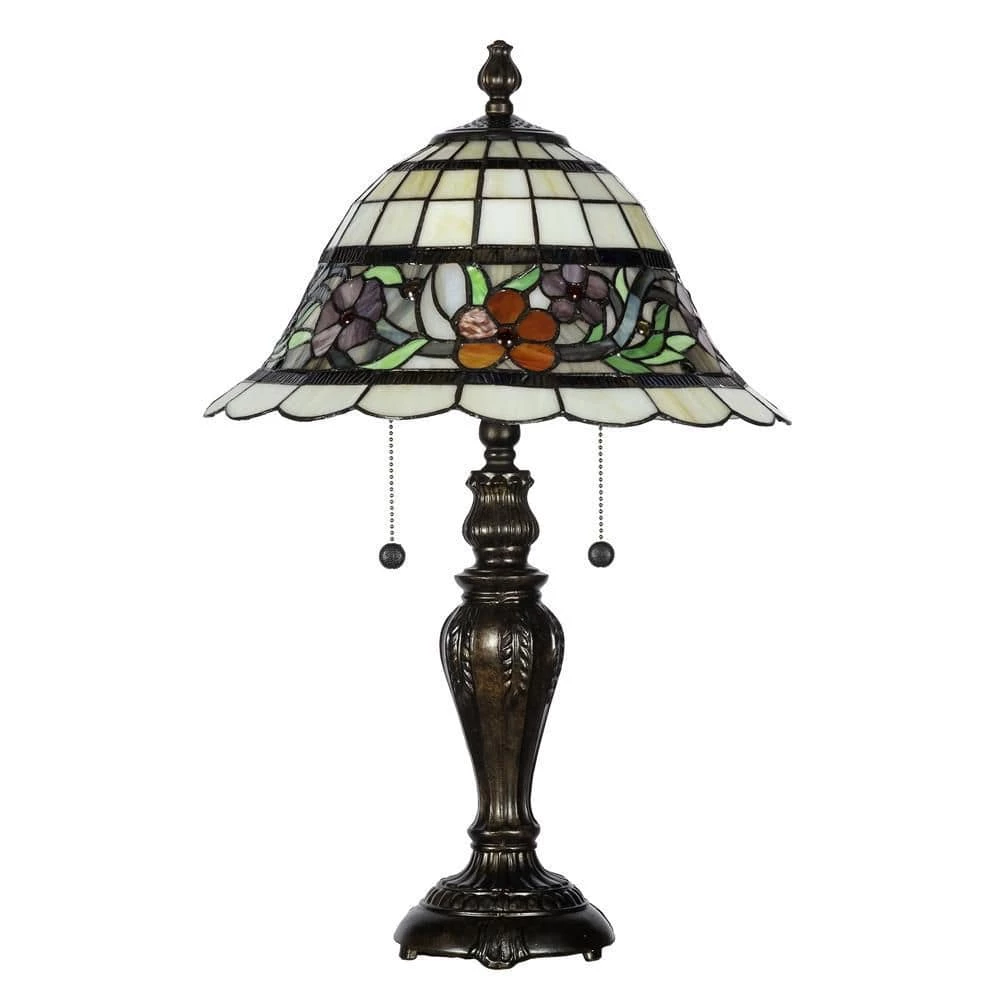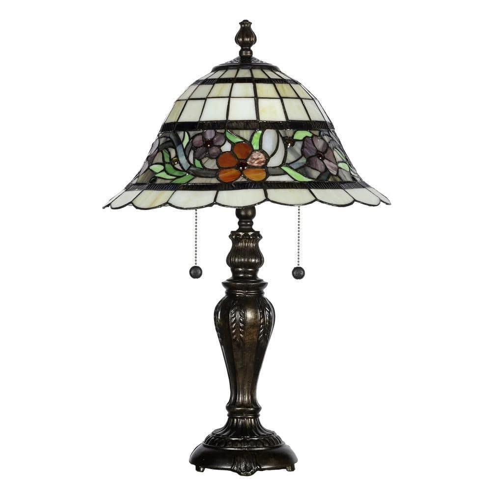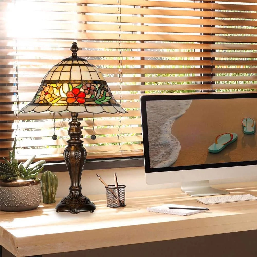 A wonderful blend of texture and color, our Seville Floral Tiffany Table Lamp will easily assimilate into any room in your home or office. The dome shade features a background of alabaster art glass squares that are set a grid pattern that is accented with bold filigree. A wide band of florals in bright yellow, green, and red runs around the shade’s circumference. The band features a meandering green vine and is dotted with glass gems throughout. The metal base is finished in Antique Bronze. A pretty choice for bedrooms or living rooms, our Seville Floral Tiffany Table Lamp also makes a lovely work lamp on larger writing desks.