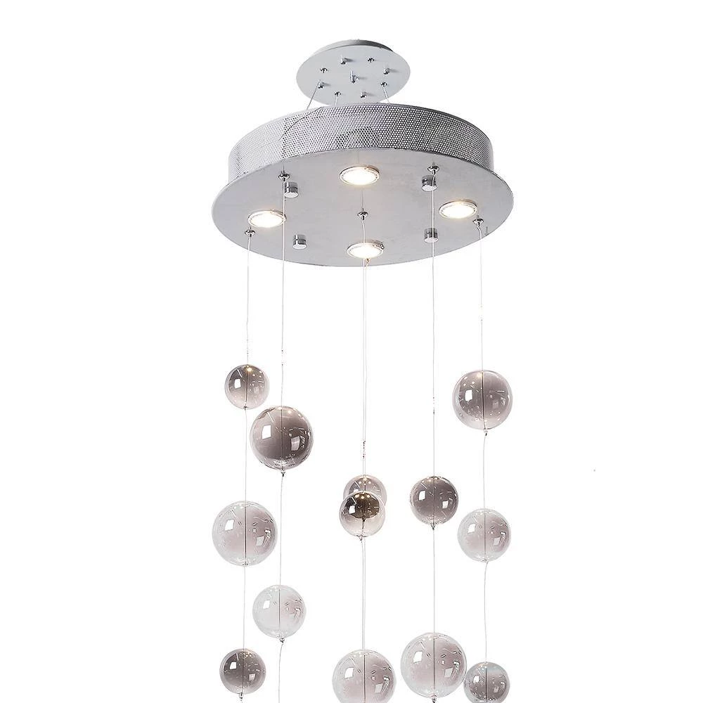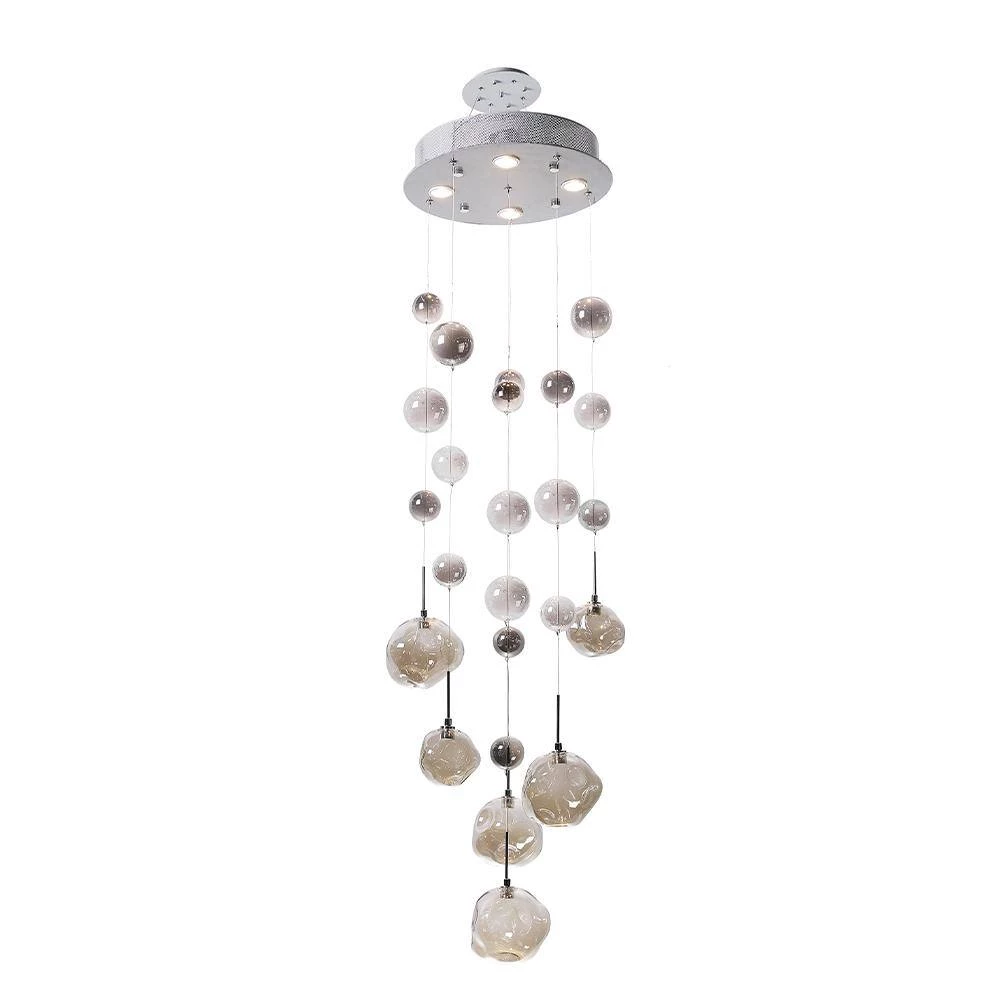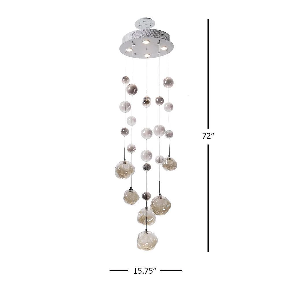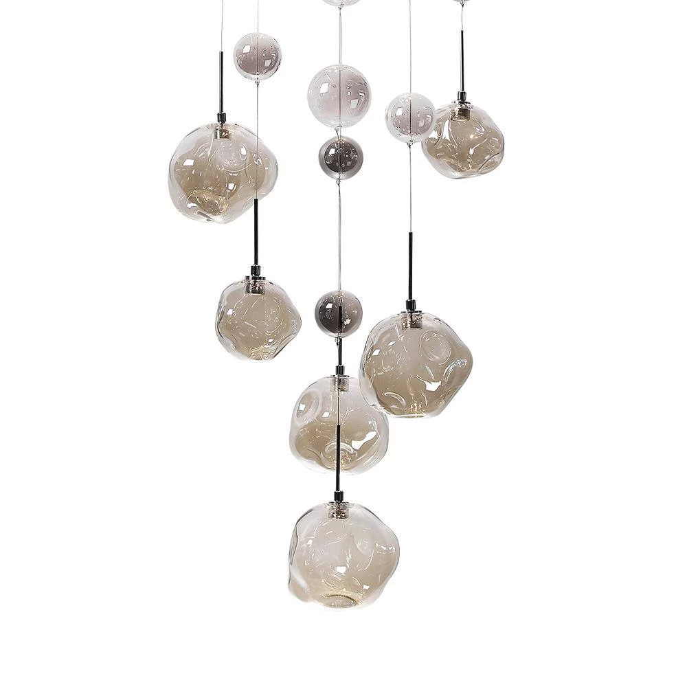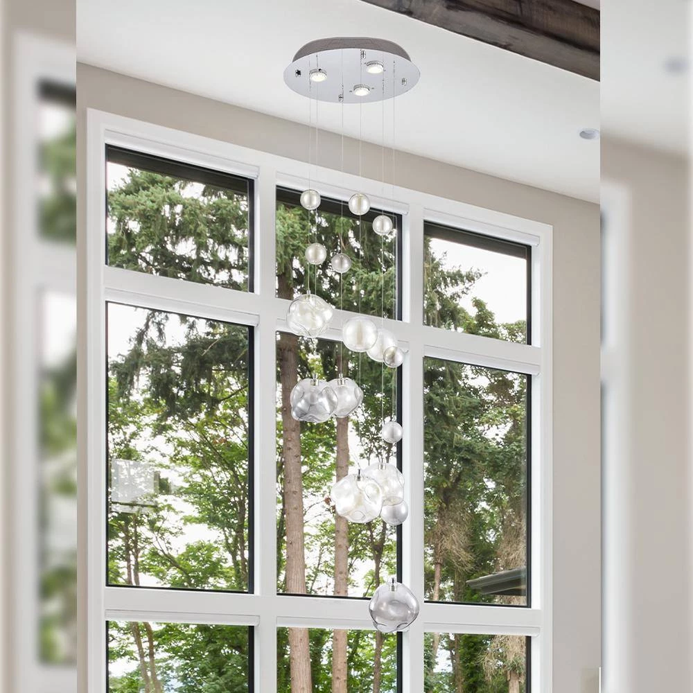 Our mesmerizing Sylas Hand Blown Art Glass Hanging Fixture is a dazzling illuminated Object d’art that will win rave reviews from family and guests alike. The fixture hangs gracefully from a metal flush mount fixture, finished in gleaming Chrome. 3 cut outs in the bottom provide spot light for the suspended art glass orbs below. Hung from wire cables of varying lengths to create a sense of movement, each cable holds a group of hand blown silver art glass bubbles in various shapes to create this ultra-modern work of illuminated art. Because the glass is hand blown, please allow for slight variations in color and texture. A pretty way to light a dining area, try hanging our Sylas Hand Blown Art Glass Hanging fixture in multiples in a formal foyer for a truly spectacular effect. NOTE: Due to the nature of handmade art glass, colors, sizes and patterns may vary slightly.