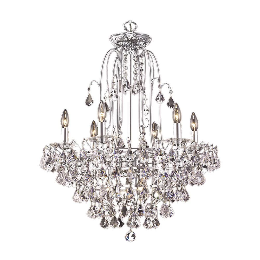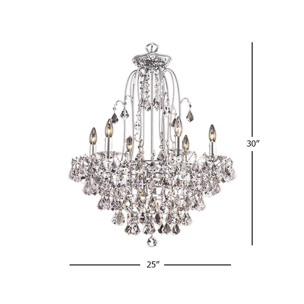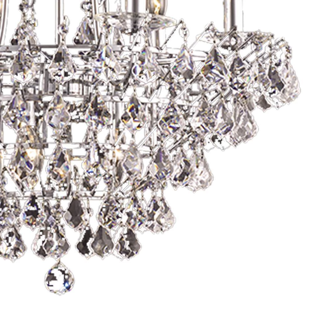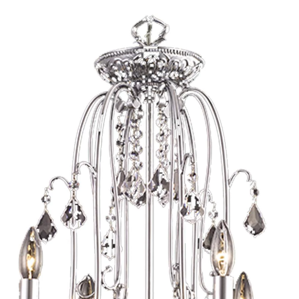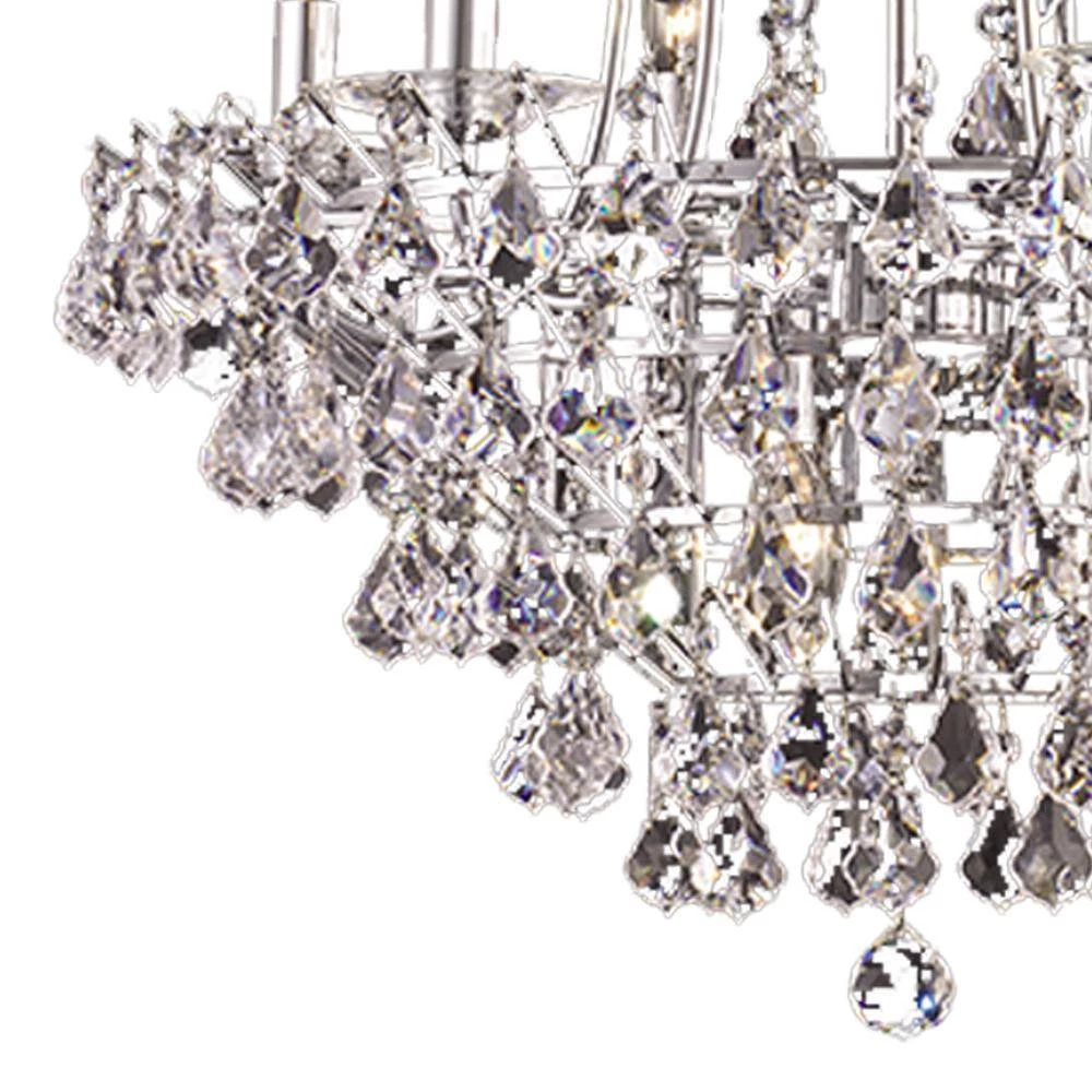 Our stupendous Tennyson Chandelier features a vintage feel that easily blends with even the most modern home decor. The beautiful fixture features a metal base that is finished in glistening Polished Chrome. Just under a meticulously cast metal canopy, hangs a series of crystal beaded chain. 9 gracefully scrolled metal arms extend downward to a candelabra base and crystal candle cup. Each is adorned with faceted crystal teardrops. At the bottom of the chandelier, graduated rings of matching crystal teardrops add extra-sparkle. Tennyson hangs from a metal ceiling canopy and wire cable/chain that are finished to match in lustrous Polished Chrome. A lovely fixture over a formal dining area, our Tennyson Chandelier also makes an elegant whole room fixture in rooms with higher ceilings.