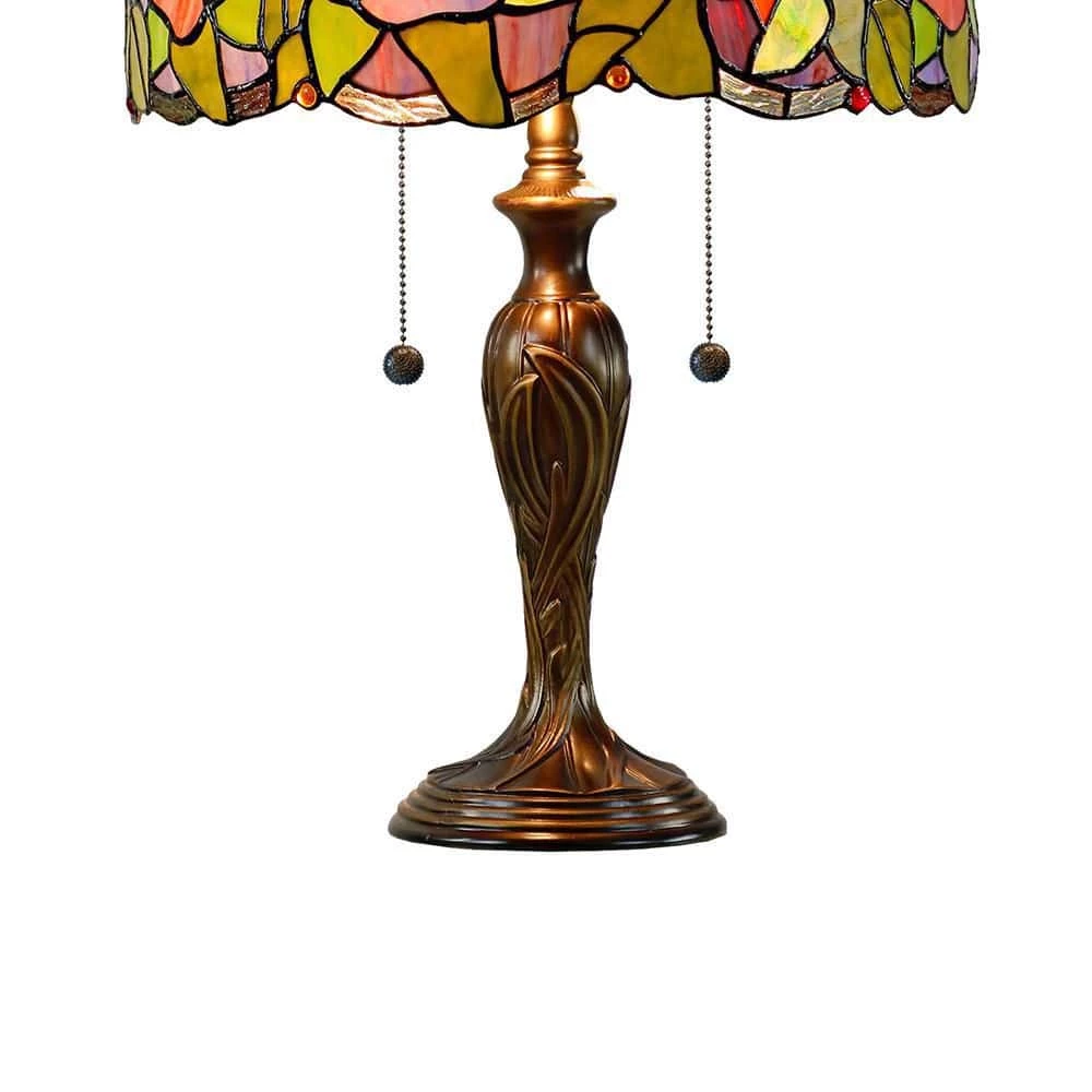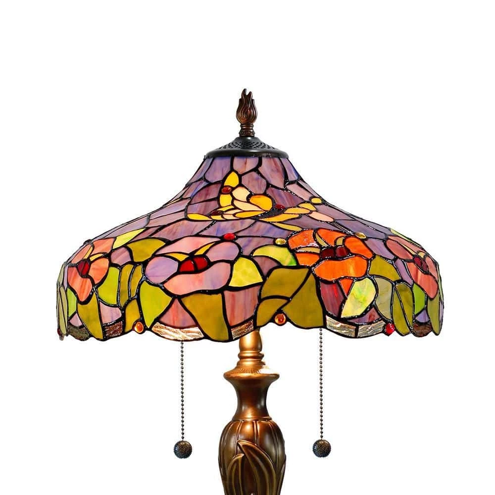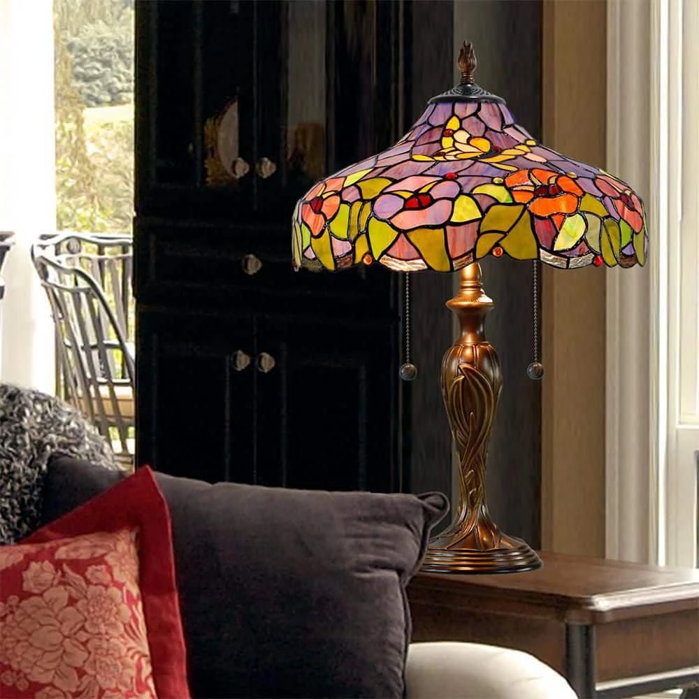 Louis Comfort Tiffany’s love of nature shines through again in the lovely Toscany Garden table lamp. Lovely purple art glass is the setting for lush orange & purple flowers. Grouped together against verdant green foliage and accented with deep ruby art glass jewels. The graduated pedestal base features a leaf pattern and is finished in antique bronze, which adds to the natural feel of the lamp and makes this an excellent choice for sun rooms, bedrooms, sitting rooms and family rooms.
