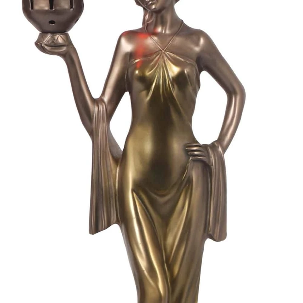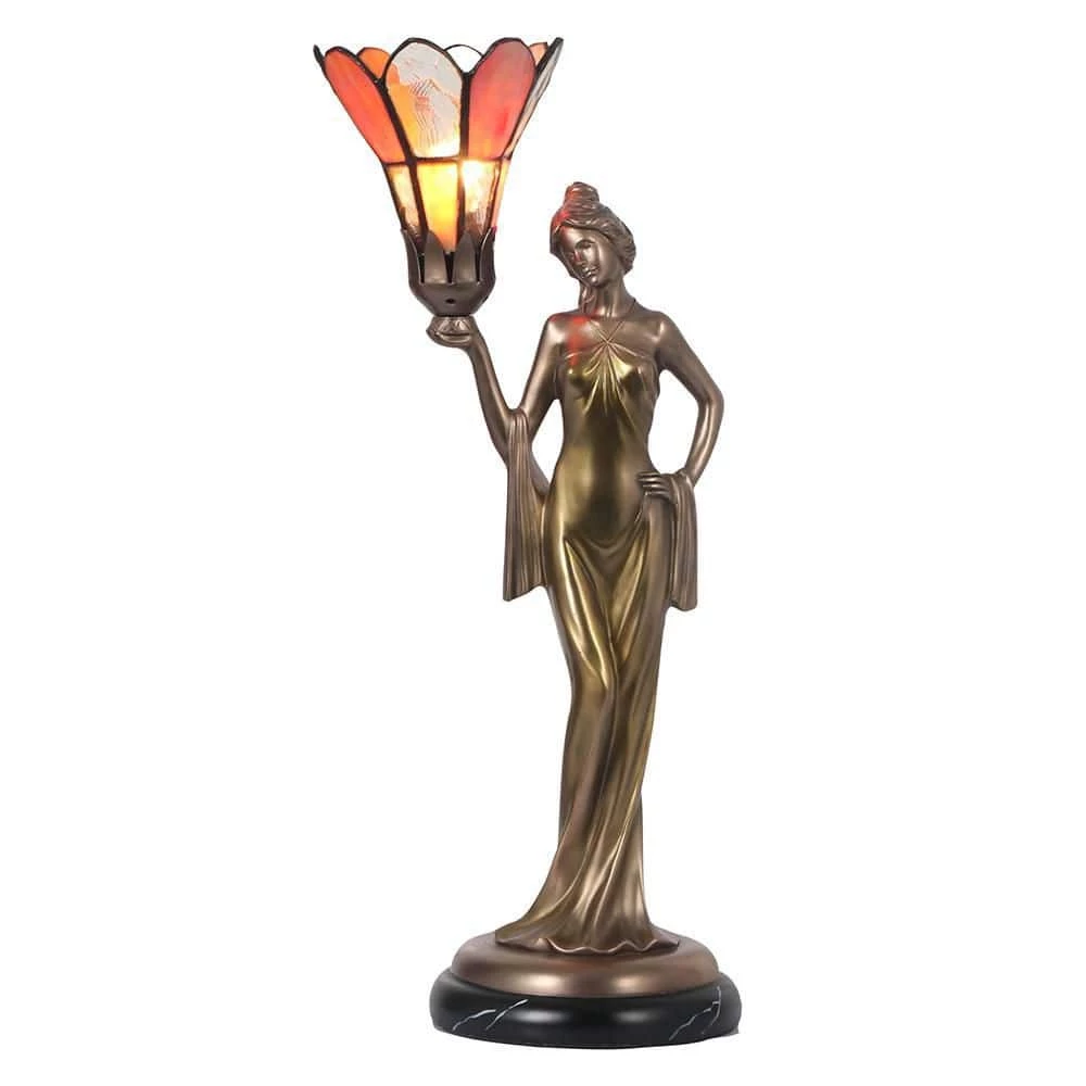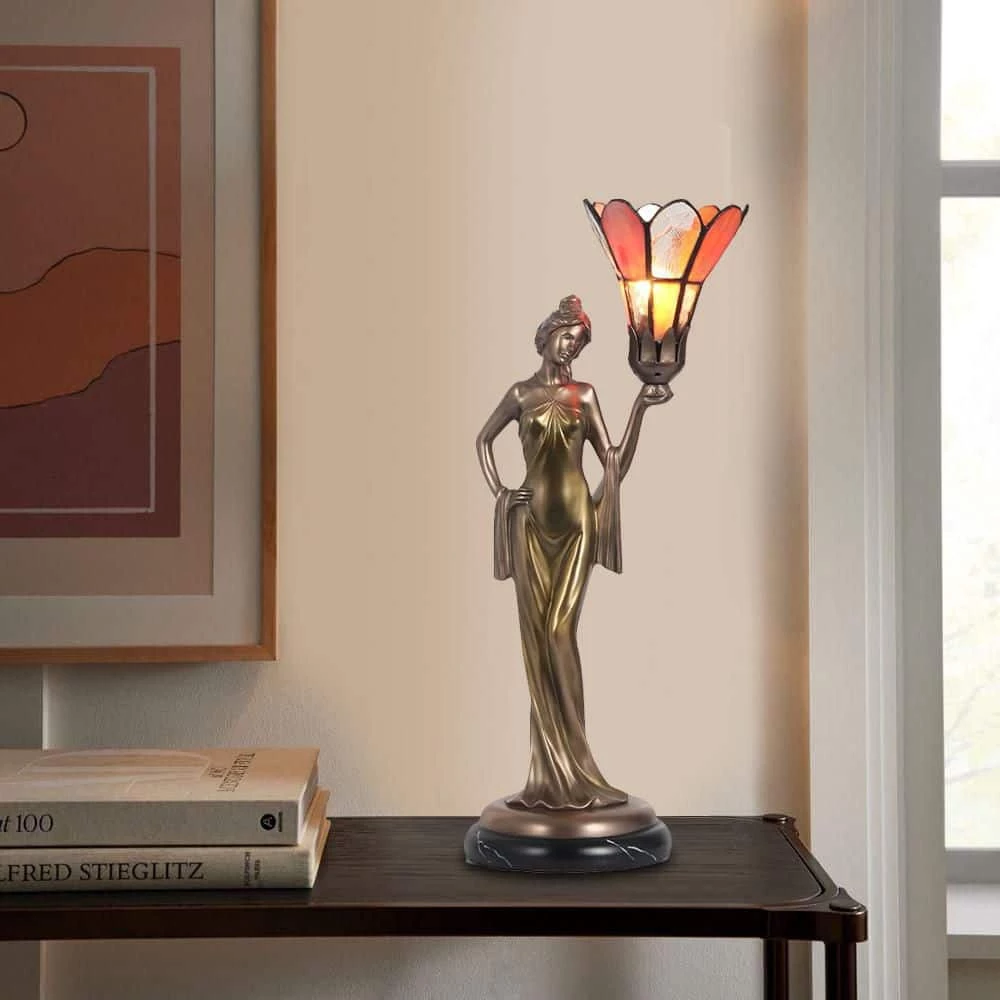 Vita Lady Tiffany Accent Lamp is a charming combination of functional light fixture and illuminated sculpture that will add grace and elegance to any room’s decor. The fixture, is finished in Cold Cast Bronze, features an exquisitely cast siren that is depicted in a form fitting gown that is seductively wrapped around her feet just above the black pedestal. Her hair is in a graceful updo, and her shoulders are bare with a matching wrap draped casually over her arms. One outstretched arm holds an up lit lily shade with panels in variegated amber tones separated by bold filigree for added definition. A lovely piece tucked away on a mantle or curio shelf; our Vita Lady Tiffany Accent Lamp also makes the ideal gift for almost any occasion.