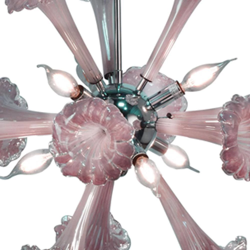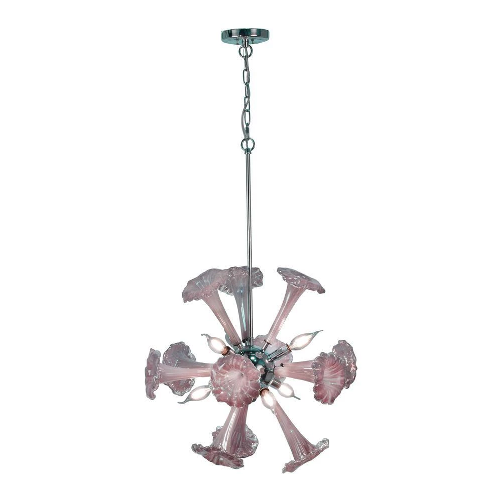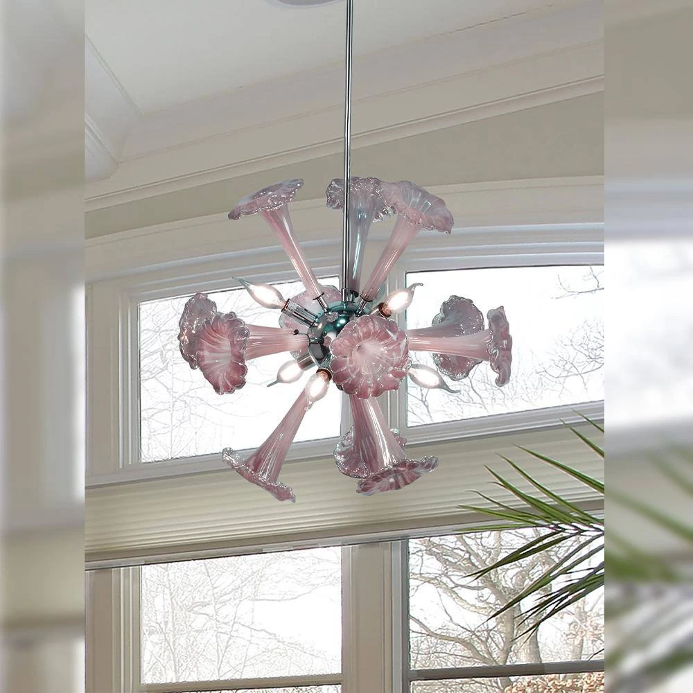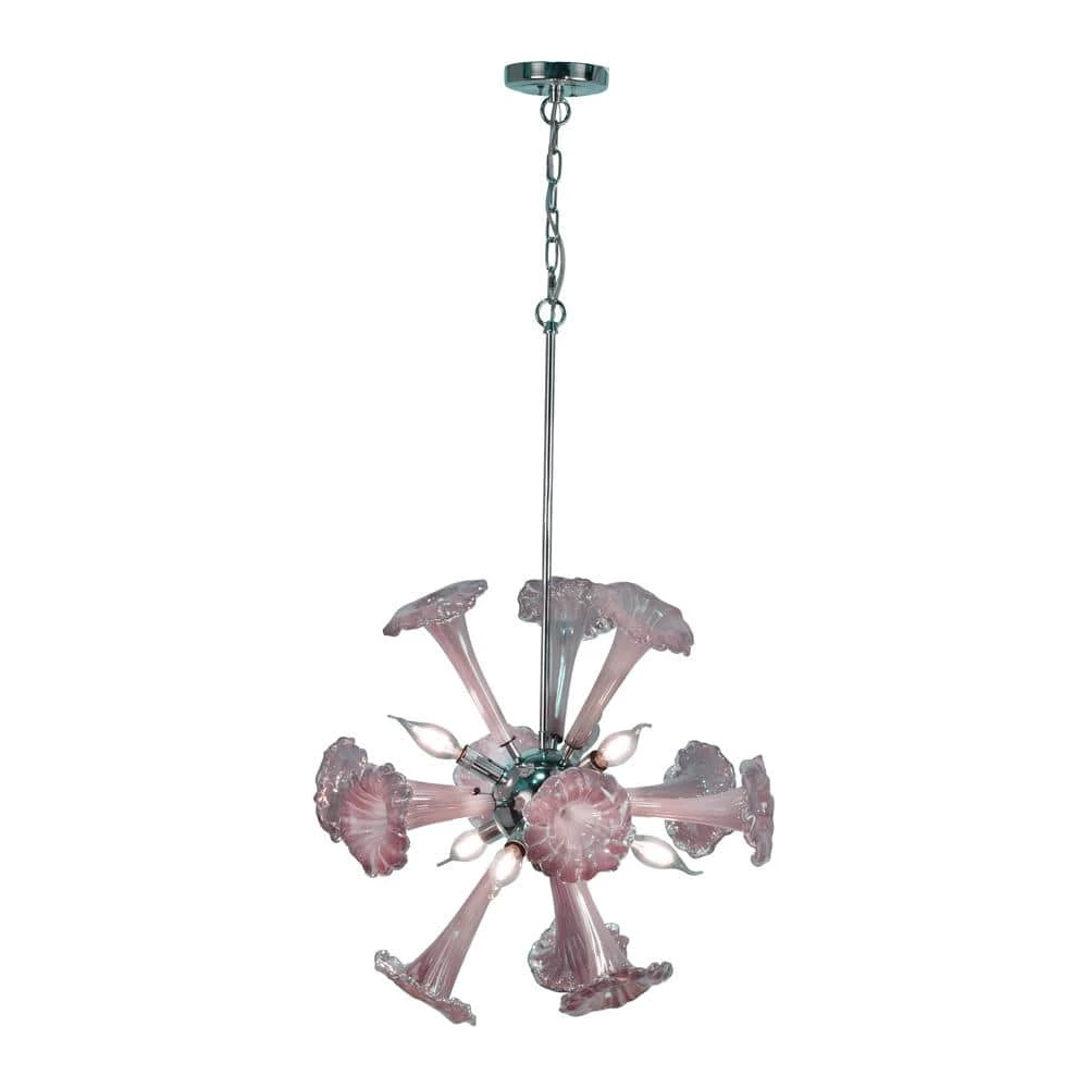 Our Yuri 6 LT Hanging Pendant is a contemporary classic that will grace any decor in your home. The fixture features a series of 6 Favrile art glass shades in warm amber tones. Each is hand blown in a generously sized floral shape infused with bright amber tones that will cast a warm glow about the room when the pendant is illuminated. The shades are set satellite style on a metal base that is finished in lustrous polished chrome. Yuri hangs from a metal ceiling canopy, wire cable/chain and center support tube that are finished to match in Polished Chrome. A stunning topper to a large dining area, our Yuri 6 LT Hanging Pendant also makes a grand fixture in foyers and entryways with higher ceilings.